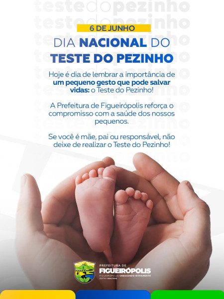 A Prefeitura de Figueirópolis reforça o compromisso com a saúde dos nossos pequenos. Se você é mãe, pai ou responsável, não deixe de realizar o Teste do Pezinho! Procure a unidade de saúde mais próxima e garanta mais segurança e qualidade de vida para o seu bebê. 💙