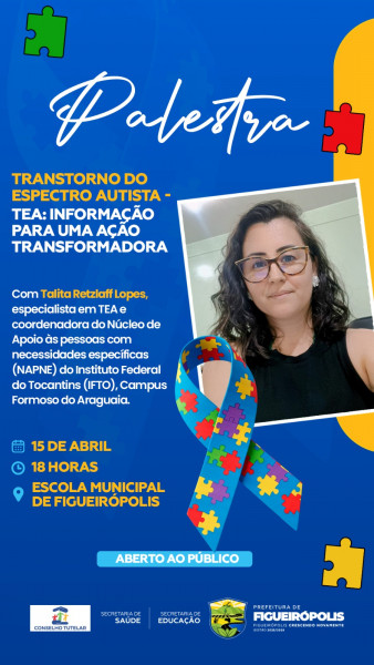 A Prefeitura de Figueirópolis convida você para um momento especial de conscientização e aprendizado sobre o Transtorno do Espectro Autista (TEA). A palestra "TEA: Informação para uma ação transformadora" será ministrada por Talita Retzlaff Lopes, especialista em TEA e coordenadora do NAPNE/IFTO – Campus Formoso do Araguaia.