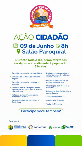 No próximo dia 09 de junho, a Prefeitura de Figueirópolis promove mais uma grande iniciativa voltada ao bem-estar da nossa população. A partir das 8h da manhã, no Salão Paroquial, diversos serviços gratuitos estarão disponíveis para facilitar a vida do cidadão e garantir direitos fundamentais.