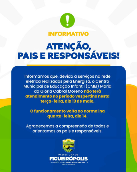 Informamos que, devido a serviços na rede elétrica realizados pela Energisa, o Centro Municipal de Educação Infantil (CMEI) Maria da Glória Cabral Moreno não terá atendimento no período vespertino na terça-feira, dia 14 de maio.