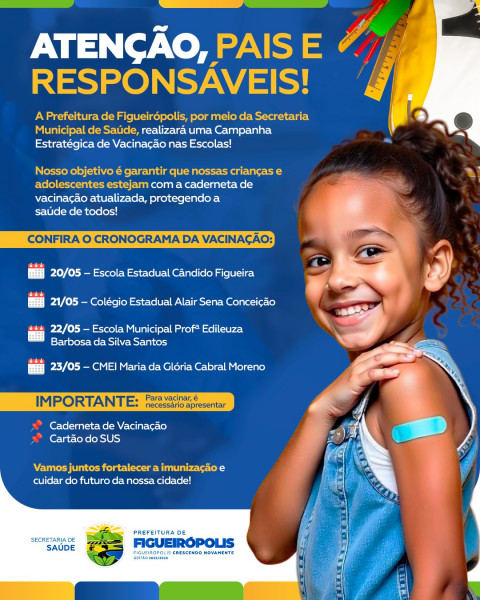 A Prefeitura de Figueirópolis, por meio da Secretaria Municipal de Saúde, realizará uma Campanha Estratégica de Vacinação nas Escolas!
