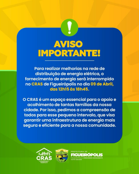 Na próxima quarta-feira, 09 de abril, o fornecimento de energia será temporariamente interrompido no CRAS de Figueirópolis, das 12h15 às 18h45, para que sejam realizadas melhorias na rede de distribuição elétrica.