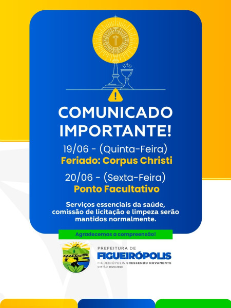 Em razão ao feriado de Corpus Christi, celebrado nesta quinta-feira, 19, a Prefeitura de Figueirópolis informa como será o horário especial de funcionamento nos dias 19 (feriado) e 20 (ponto facultativo).