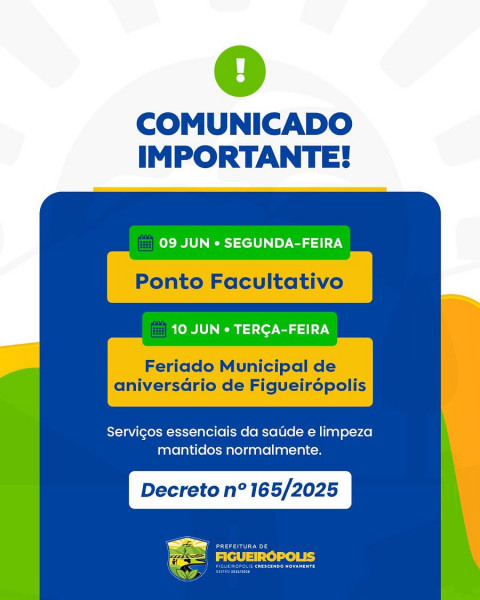 A Prefeitura de Figueirópolis informa à população sobre o Ponto Facultativo e Feriados Municipal em celebração ao aniversário da cidade