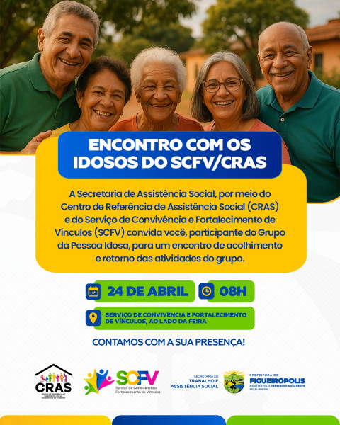 A Secretaria de Assistência Social, por meio do Centro de Referência de Assistência Social (CRAS) e do Serviço de Convivência e Fortalecimento de Vínculos (SCFV) convida você, participante do Grupo da Pessoa Idosa, para um encontro de acolhimento e retorno das atividades do grupo.