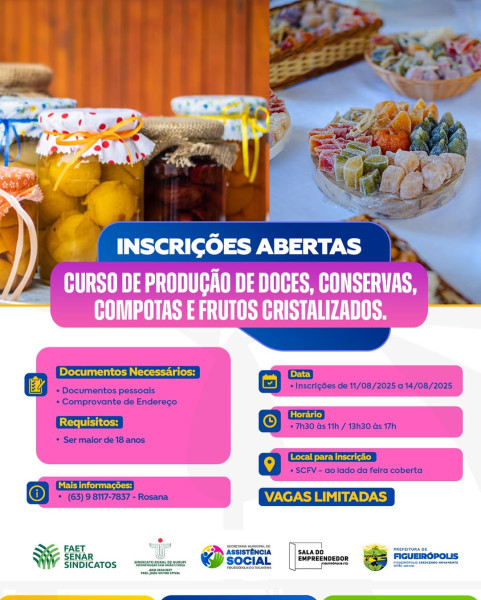 Estamos com inscrições abertas para o curso de Produção de doces, conservas, compotas e frutos cristalizados.🤩