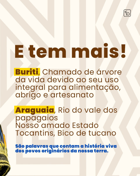 Muitas palavras que usamos no dia a dia, nomes de lugares e elementos da nossa cultura têm origem indígena sinais vivos da presença e da contribuição desses povos na formação do Tocantins e do Brasil.